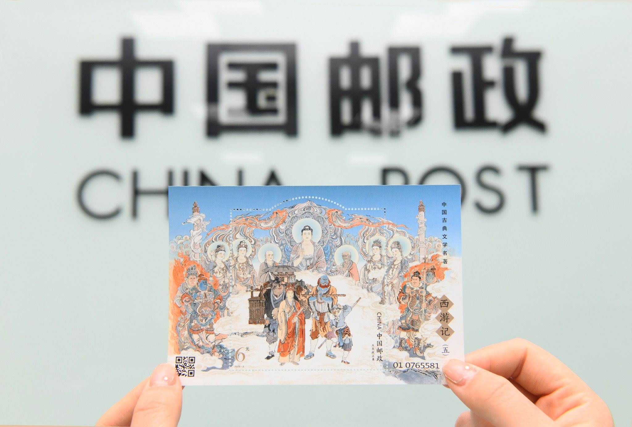 2023年4月27日,中國(guó)郵政集團(tuán)公司河北省新樂(lè)市分公司,工作人員展示發(fā)行的《中國(guó)古典文學(xué)名著—<西游記>(五)》特種郵票。視覺(jué)中國(guó)