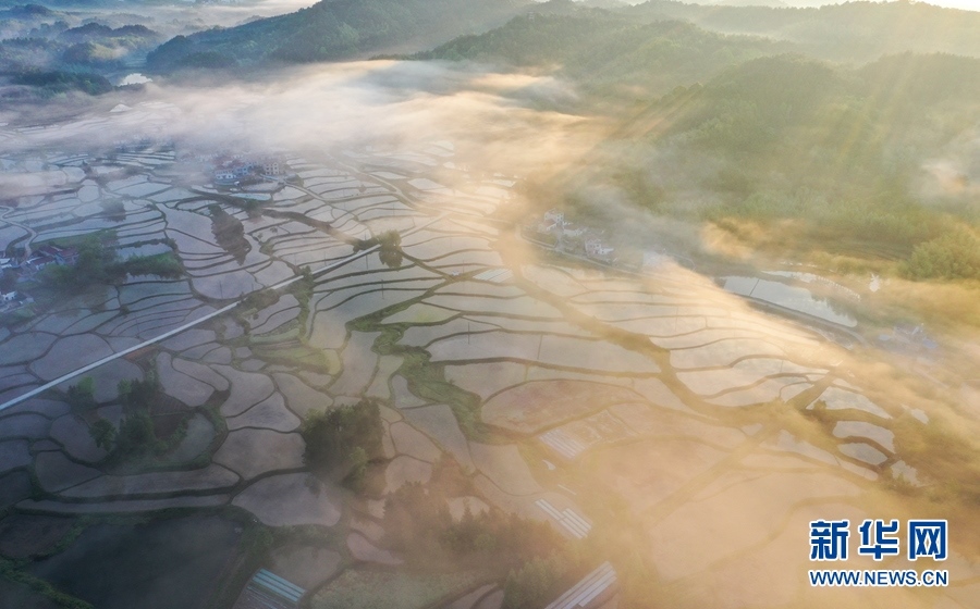 春日清晨,航拍安徽省宣城市旌德縣興隆鎮(zhèn)三山村,線條優(yōu)美的梯田、若隱若現(xiàn)的村莊、濃淡相宜的云霧、變幻莫測的朝霞,描繪出一幅幅美麗的鄉(xiāng)村畫卷。