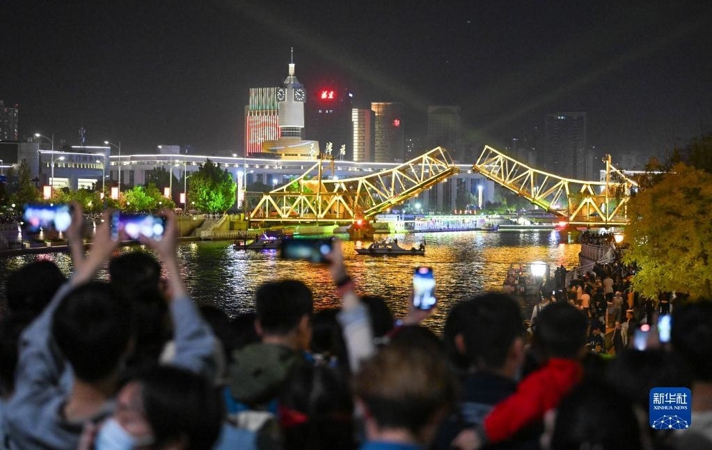 5月1日晚,位于天津海河上的標(biāo)志性建筑物解放橋橋梁開(kāi)啟,橋梁開(kāi)啟角度達(dá)到最大角度60度。
