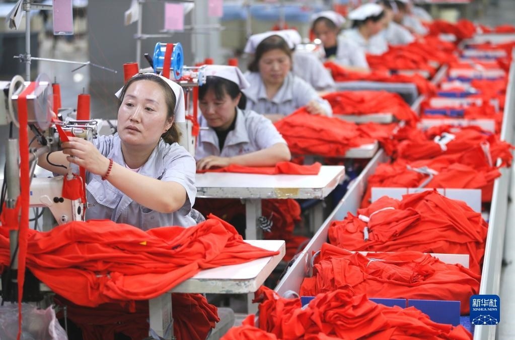 5月4日,在山東省青島市即墨區(qū)一家服裝企業(yè),工人生產出口到海外市場的服裝。