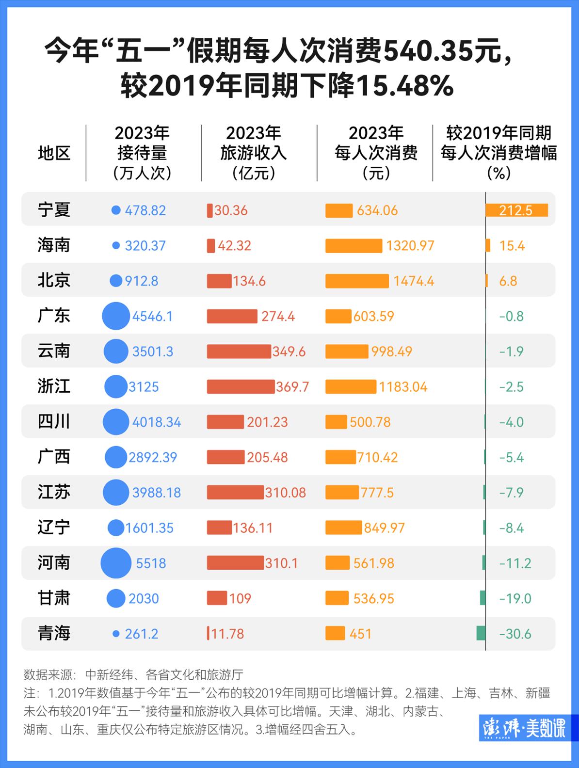 然而,人流井噴的背后,消費卻暫未回歸。以文旅部公布的數據進行計算,今年“五一”假期每人次消費540.35元,較2019年同期下降15.48%。澎湃新聞記者還統(tǒng)計了各省的“五一”消費成績單,發(fā)現大部分省市的每人次消費,較2019年同期皆有所下降。