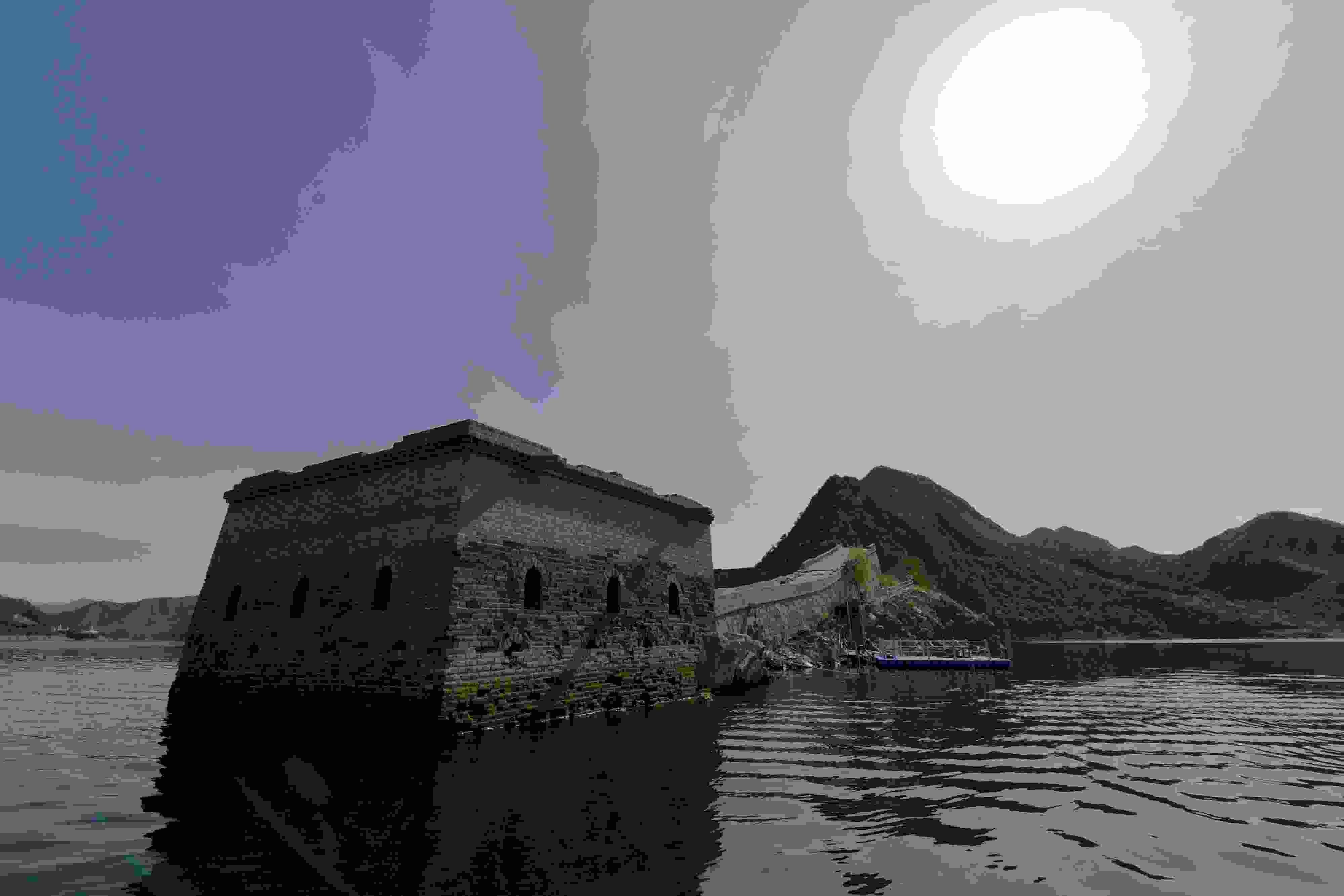 2023年5月8日,河北承德,寬城滿族自治縣境內(nèi)潘家口水庫(kù)的“水下長(zhǎng)城”。這段“水下長(zhǎng)城”是明長(zhǎng)城的遺址,20世紀(jì)70年代因建設(shè)水利樞紐工程,部分長(zhǎng)城隱沒水下,從而形成“水下長(zhǎng)城”景觀。 視覺中國(guó)