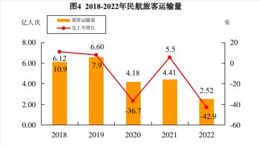 2018年至2022年民航旅客運(yùn)輸量。來源于2022年民航行業(yè)發(fā)展統(tǒng)計公報