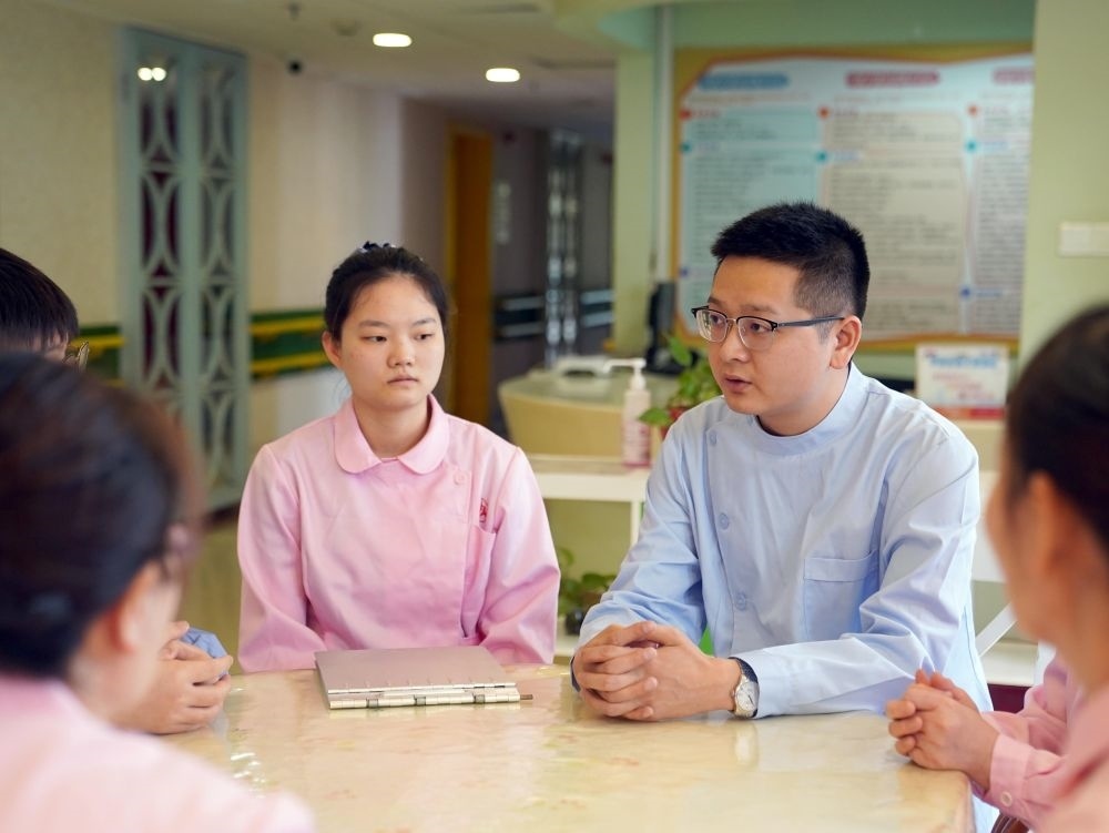 在上海市楊浦區(qū)社會福利院,護(hù)理主管王程(右)在護(hù)理員例會上點(diǎn)評發(fā)言(4月28日攝)。新華社記者 劉穎 攝