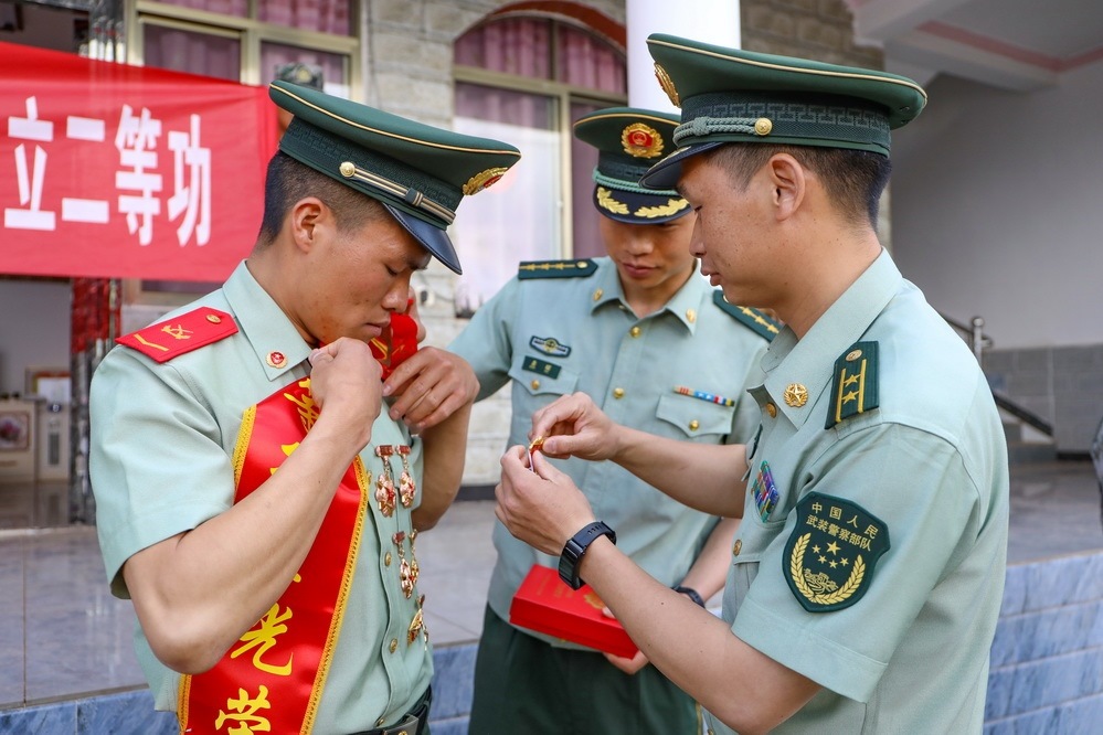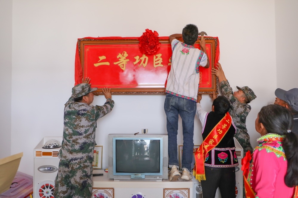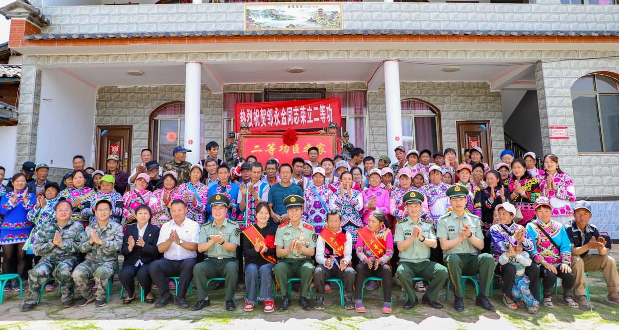 鑼鼓喧天,鞭炮齊鳴。近日,云南省楚雄彝族自治州大姚縣桂花鎮(zhèn)大河村張燈結彩、熱鬧非凡,武警云南總隊昭通支隊派出送喜報小分隊輾轉600余公里來到這里,聯(lián)合當?shù)厝宋洳亢屯艘圮娙耸聞站?,為榮立個人二等功的現(xiàn)役軍人鄒永金的家屬送去喜報、牌匾和慰問金。