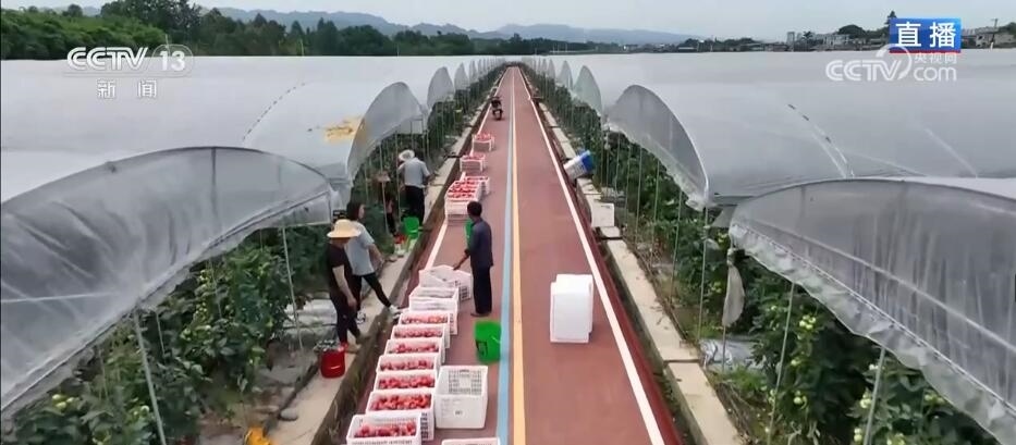 總臺(tái)記者 蔣林:歡迎各位繼續(xù)跟隨著我們?cè)谒拇纯础叭摹睍r(shí)節(jié)的農(nóng)忙景象。此刻我從平原地區(qū)的水稻高標(biāo)準(zhǔn)農(nóng)田來到了金銀河村的蔬菜種植產(chǎn)業(yè)園。通過空中航拍的畫面大家可以看到,金銀河村緊臨著長(zhǎng)江的三級(jí)支流青衣江,歷史上的金銀河村就是來自青衣江的沖刷和堆積,村里的土地含沙量高,土壤保水能力不夠,不適合栽種像水稻這樣的需要農(nóng)田蓄水、保水的作物。當(dāng)然,這樣的土地對(duì)于很多蔬菜品種來說,卻是絕佳好地,當(dāng)?shù)匾虻刂埔烁闫鹆怂竞褪卟斯灿械默F(xiàn)代產(chǎn)業(yè)園區(qū)。在這個(gè)園區(qū),適合蔬菜種植的面積達(dá)到7萬畝,平均一年能種三季蔬菜,大大提升了土地產(chǎn)出與利用效果,也保證了每一個(gè)人的“菜籃子”。眼下,今年春天播種的番茄、黃瓜、茄子、豇豆等眾多時(shí)令蔬菜陸續(xù)成熟,新鮮上市,讓我們感受到初夏時(shí)節(jié)的豐收景象。