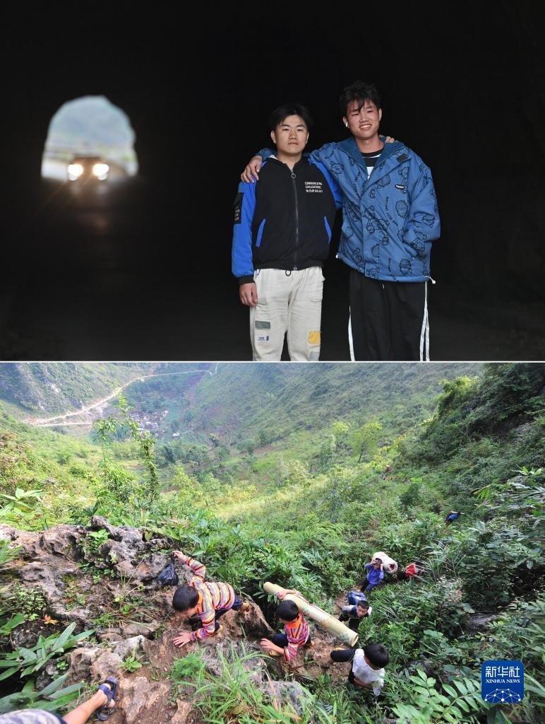 拼版照片:上圖為2023年1月20日,在大化瑤族自治縣板升鄉(xiāng)弄勇村,22歲的蒙宣任(左)和弟弟蒙宣汰站在通往弄勇小學(xué)的隧道旁合影,隧道上方是他們兒時(shí)上學(xué)需要攀爬的“天梯”;下圖為2012年9月3日,在大化瑤族自治縣板升鄉(xiāng)弄勇村,蒙宣汰(左一)、蒙宣任(左二)爬山路去學(xué)校。蒙宣任目前在遼寧省交通高等專(zhuān)科學(xué)校讀書(shū),弟弟蒙宣汰從技校畢業(yè)后在廣東一家汽修廠上班。