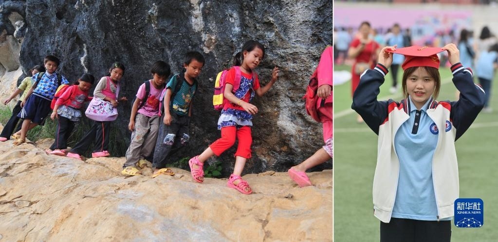 拼版照片:左圖為2012年9月3日,在大化瑤族自治縣板升鄉(xiāng)弄雷村,8歲的蒙麗丹(右一)爬懸崖去學(xué)校讀書(shū);右圖為2023年5月20日,蒙麗丹在廣西大化瑤族自治縣高級(jí)中學(xué)高三成人禮上(新華社記者胡星宇攝)。即將參加高考的蒙麗丹,希望以后能回到大山里當(dāng)老師。
