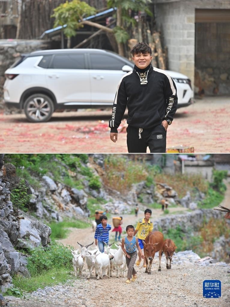 拼版照片:上圖為2023年1月21日,在大化瑤族自治縣板升鄉(xiāng)弄勇村,22歲的蒙宣朝站在自己剛剛購(gòu)買(mǎi)的汽車(chē)前;下圖為2012年7月16日,在大化瑤族自治縣板升鄉(xiāng)弄勇村,11歲的蒙宣朝(前)利用暑假幫家里放牧。技校畢業(yè)后,蒙宣朝到廣東工作。