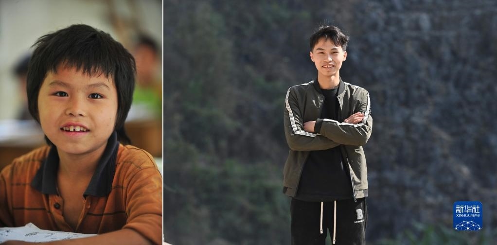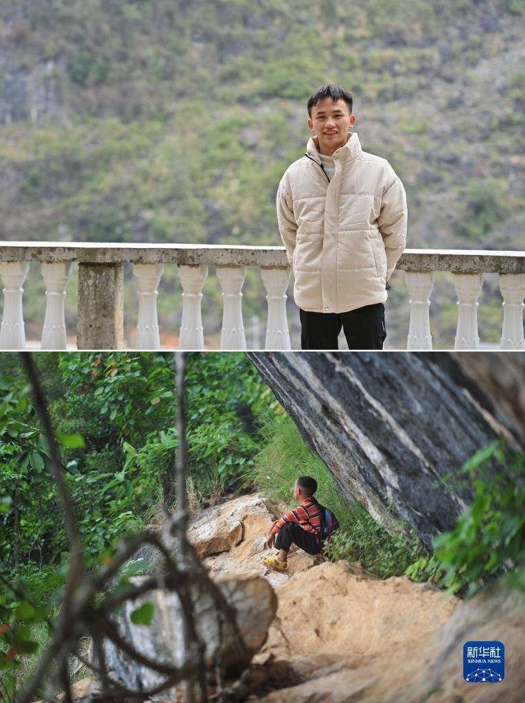 拼版照片:上圖為2023年1月16日,在大化瑤族自治縣板升鄉(xiāng)弄雷村,即將從技校畢業(yè)的蒙科佑站在家門(mén)口;下圖為2012年9月5日,在大化瑤族自治縣板升鄉(xiāng)弄雷村,10歲的蒙科佑在上學(xué)途中,坐在懸崖邊上休息。21歲的蒙科佑,希望能掙錢(qián)供弟弟妹妹讀書(shū),讓他們接受更好的教育。