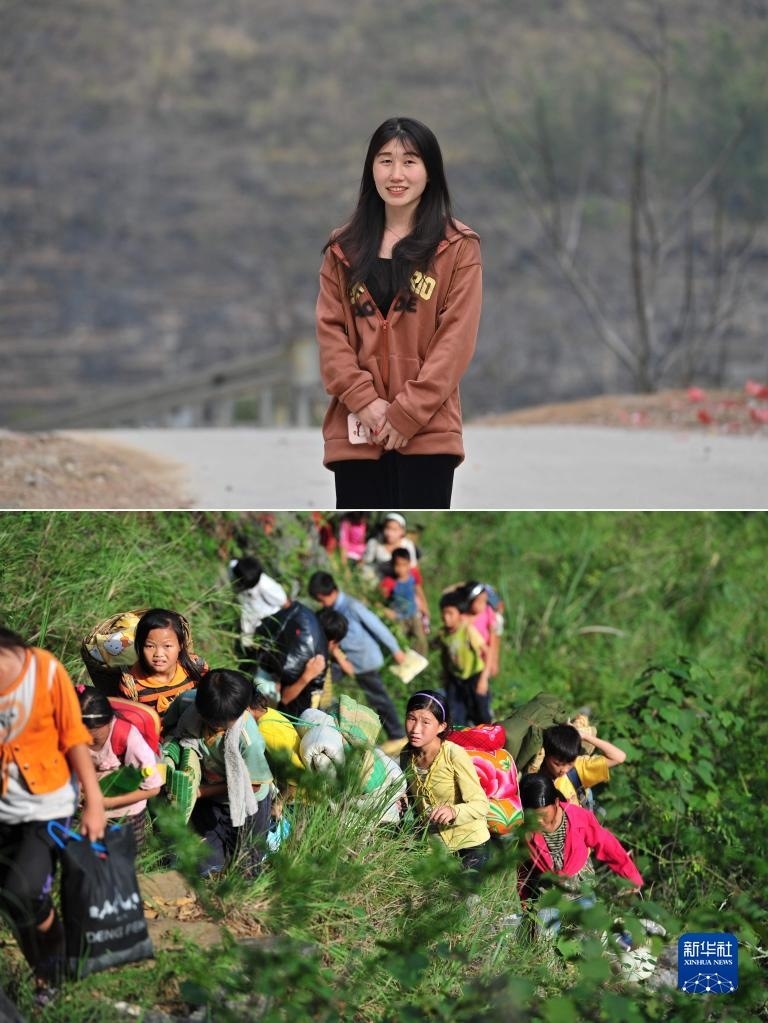 拼版照片:上圖為2023年1月21日,在大化瑤族自治縣板升鄉(xiāng)弄勇村,大專(zhuān)畢業(yè)后在廣州工作的藍(lán)秋艷回家過(guò)年時(shí)在家門(mén)口留影;下圖為2012年7月4日,學(xué)校放假后,11歲的藍(lán)秋艷(著黃衣者)背著生活用具,走在回家的山路上。22歲的藍(lán)秋艷正在努力考取教師資格證。