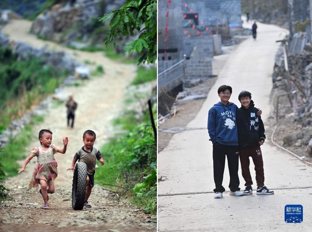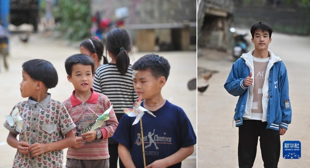 拼版照片:左圖為2012年7月4日,在大化瑤族自治縣板升鄉(xiāng)弄勇小學(xué),7歲的蒙旺兵(左二)在校園里玩風(fēng)車(chē);右圖為2023年1月25日,在大化瑤族自治縣板升鄉(xiāng)弄勇村,正在桂林理工大學(xué)讀大一的蒙旺兵寒假回家時(shí)在村中留影?! ⌒氯A社記者 黃孝邦 攝