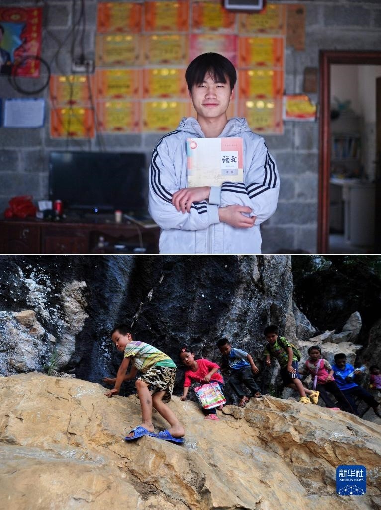 拼版照片:上圖為2023年1月26日,在大化瑤族自治縣板升鄉(xiāng)弄雷村,大化瑤族自治縣高級(jí)中學(xué)高二學(xué)生蒙文超站在家里,身后的墻上貼滿(mǎn)獎(jiǎng)狀;下圖為2012年9月5日,在大化瑤族自治縣板升鄉(xiāng)弄雷村,7歲的蒙文超(左一)放學(xué)后爬懸崖回家。今年18歲的蒙文超最大的夢(mèng)想是一年后考上理想的大學(xué)。