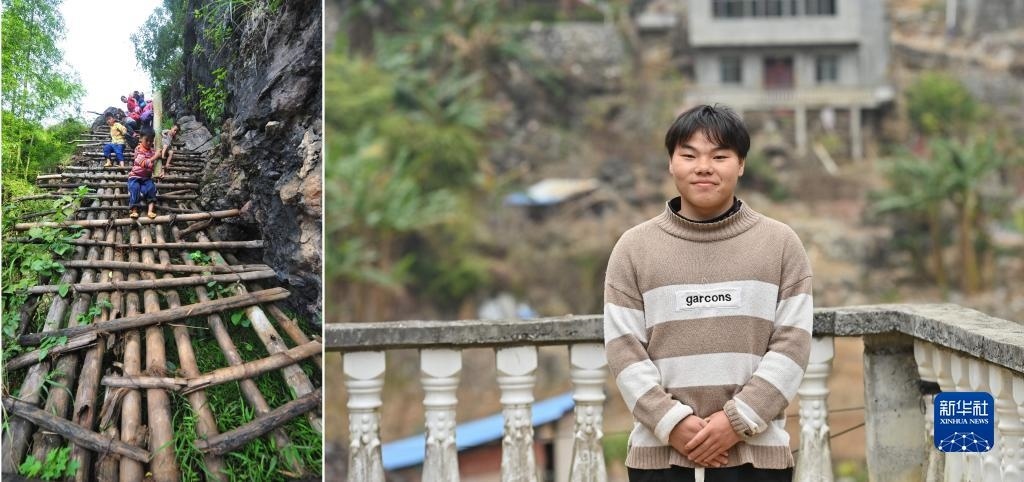 拼版照片:左圖為2012年9月3日,在大化瑤族自治縣板升鄉(xiāng)弄勇村,7歲的藍(lán)天德(右一)攀爬“天梯”去學(xué)校;右圖為2023年1月23日,在大化瑤族自治縣板升鄉(xiāng)弄勇村,即將從技校畢業(yè)的藍(lán)天德回家過(guò)年。18歲的藍(lán)天德計(jì)劃技校畢業(yè)后繼續(xù)讀大專(zhuān)。 新華社記者 黃孝邦 攝
