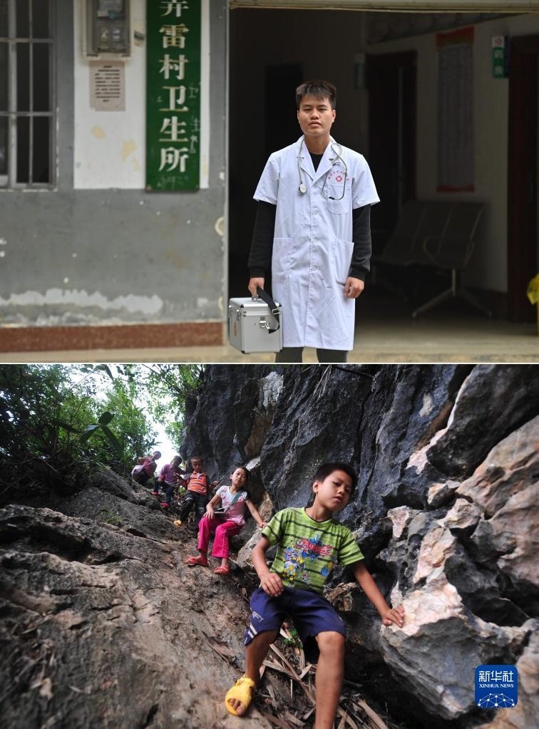 拼版照片:上圖為2023年5月24日,村醫(yī)蒙富松站在大化瑤族自治縣板升鄉(xiāng)弄雷村衛(wèi)生所前(新華社記者胡星宇攝);下圖為2012年9月5日,10歲的蒙富松(右一)爬懸崖去學(xué)校讀書(shū)(新華社記者黃孝邦攝)。2021年,蒙富松從衛(wèi)校畢業(yè),回到家鄉(xiāng)成為一名村醫(yī)。 新華社發(fā)