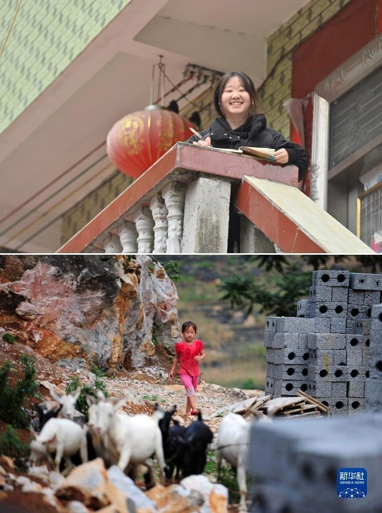 拼版照片:上圖為2023年1月16日,在大化瑤族自治縣板升鄉(xiāng)弄勇村,正在讀初中的藍(lán)秀雪在家門(mén)口學(xué)習(xí);下圖為2013年7月14日,5歲的藍(lán)秀雪在放羊。16歲的藍(lán)秀雪即將參加中考,希望能考上一所好高中。