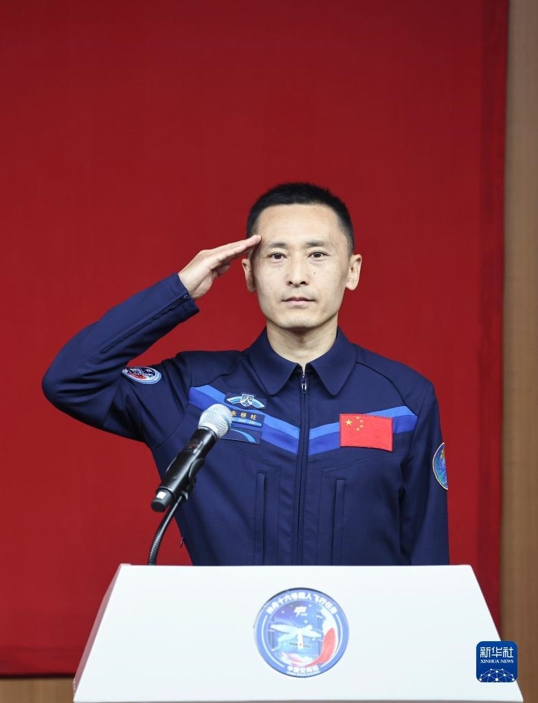 5月29日,神舟十六號(hào)航天員乘組與中外媒體記者集體見面會(huì)在酒泉衛(wèi)星發(fā)射中心問天閣舉行。這是指令長景海鵬(中)、航天飛行工程師朱楊柱(右)、載荷專家桂海潮揮手致意。   新華社記者 李剛 攝