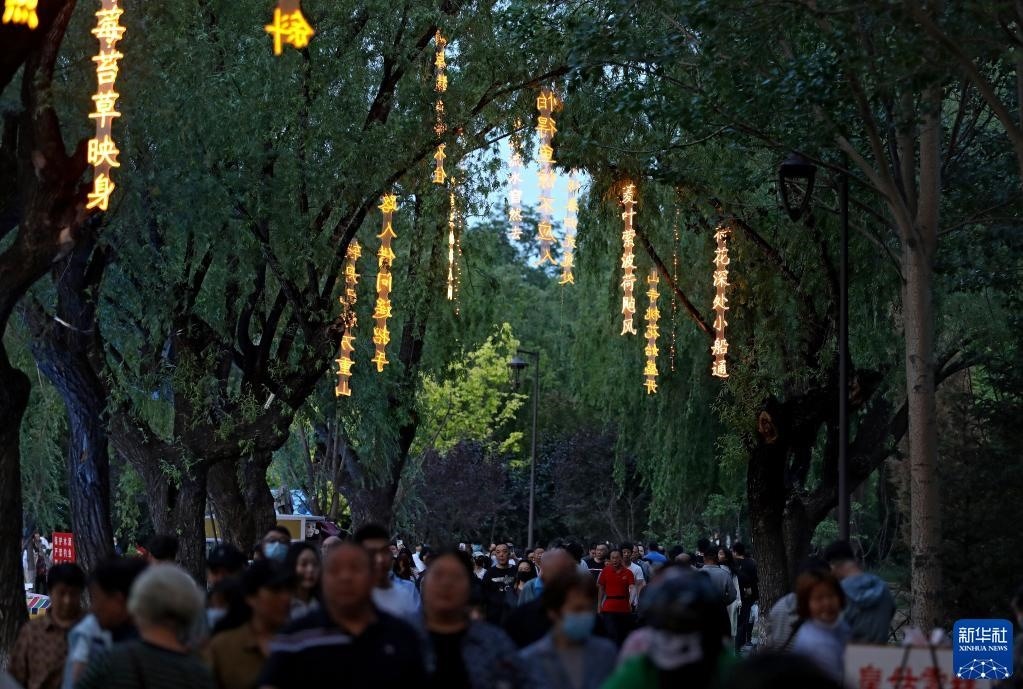 這是沈陽(yáng)萬(wàn)泉公園詩(shī)詞漫道上的古詩(shī)詞燈(5月26日攝)。