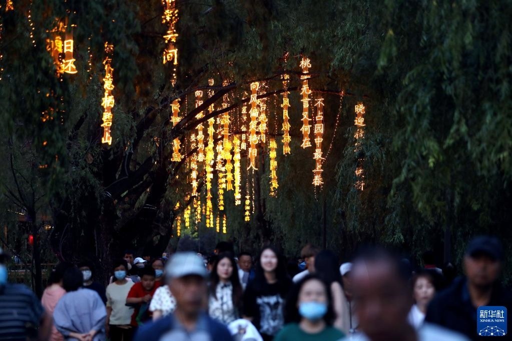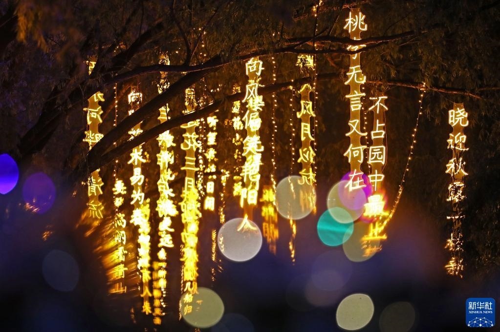 近日,沈陽(yáng)市萬(wàn)泉公園打造的一條詩(shī)詞漫道成為游客和市民的網(wǎng)紅打卡地。每當(dāng)夜幕降臨,幾十首古詩(shī)詞彩燈在這條300余米道路的樹(shù)梢枝頭熠熠閃爍,以詩(shī)入景,一步一詩(shī)。新華社記者 姚劍鋒 攝