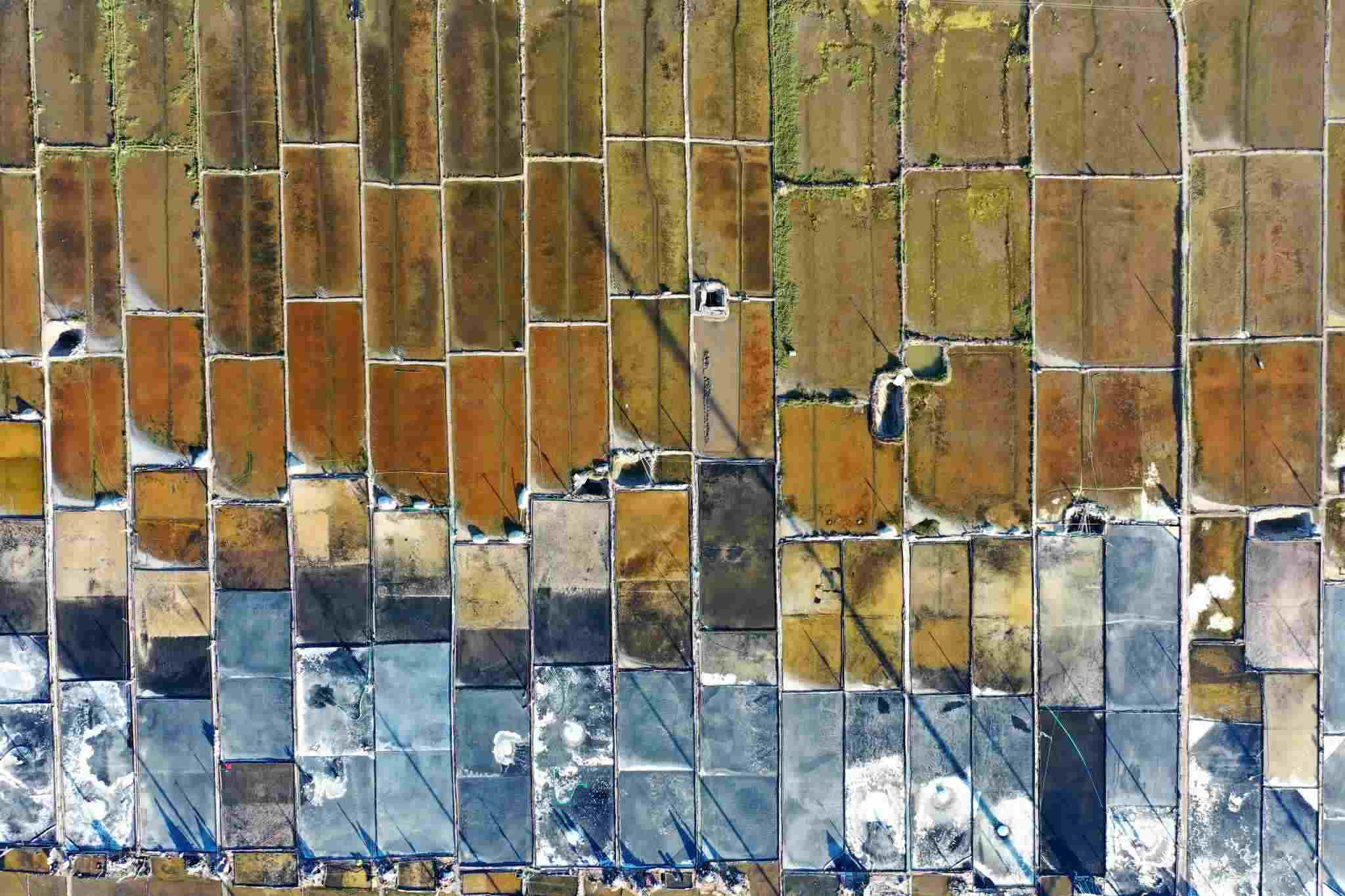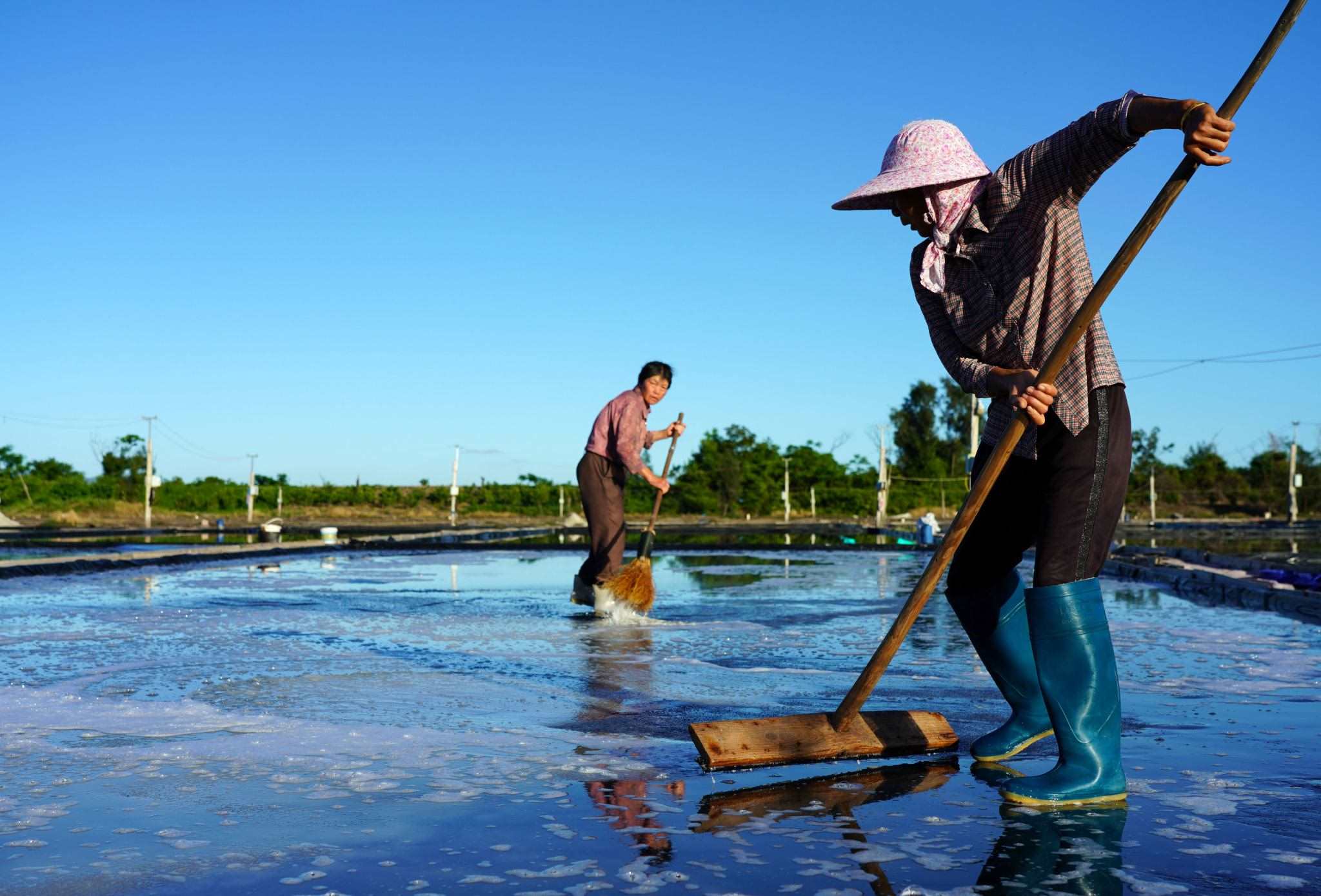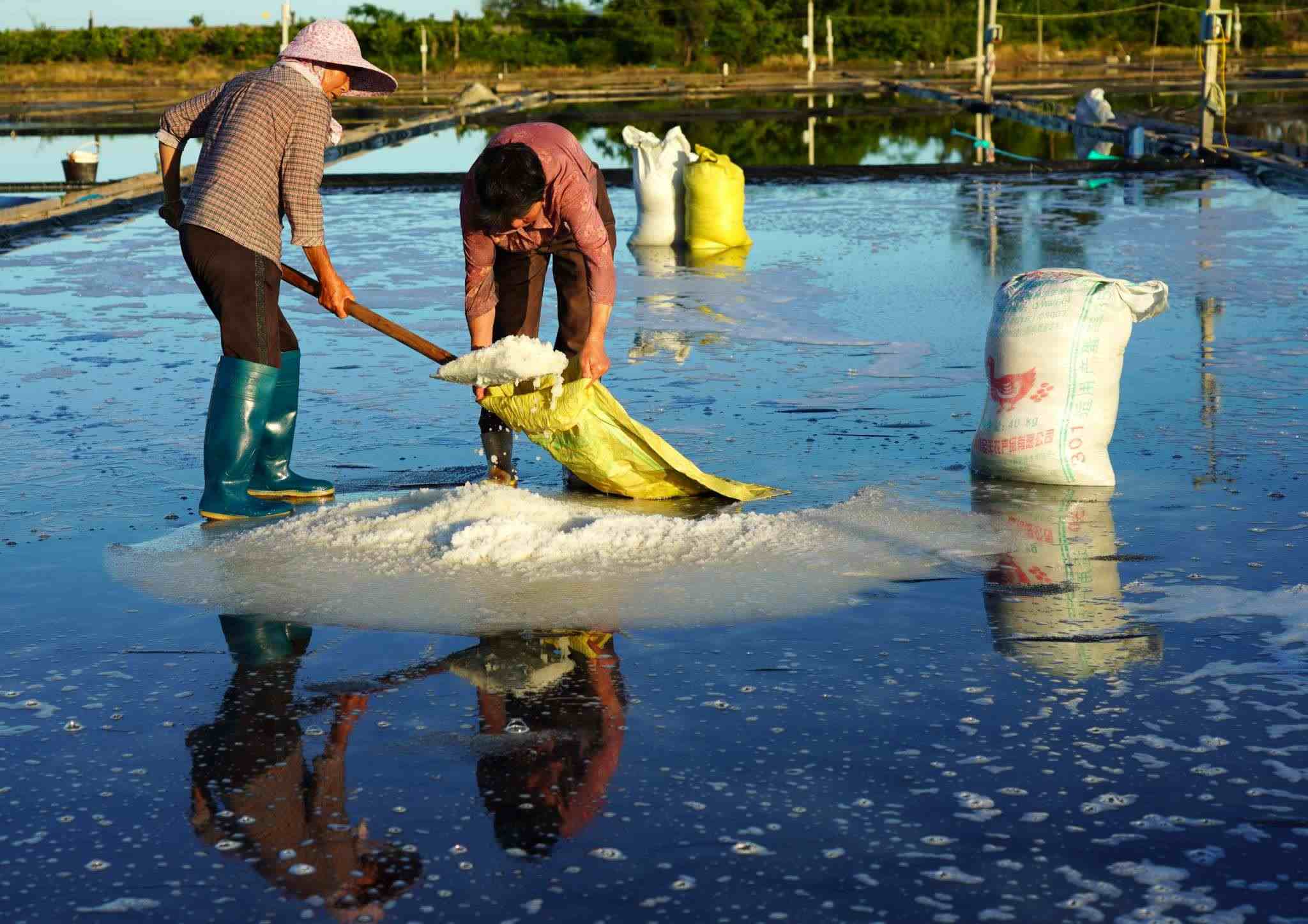 2023年5月29日,浙江溫州,在樂(lè)清市南塘鎮(zhèn)山馬曬鹽場(chǎng),鹽民在鹽田里收鹽。視覺(jué)中國(guó)