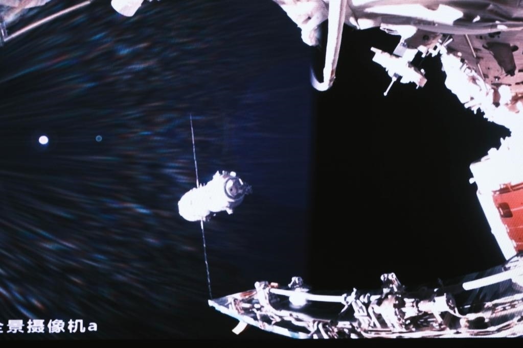 5月30日在北京航天飛行控制中心拍攝的神舟十六號載人飛船成功對接于空間站天和核心艙徑向端口的畫面。新華社記者 李杰 攝