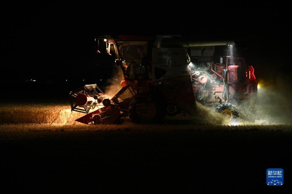 6月2日夜晚,在阜陽市阜南縣苗集鎮(zhèn)的一處麥田,農(nóng)機(jī)手駕駛收割機(jī)收割小麥。