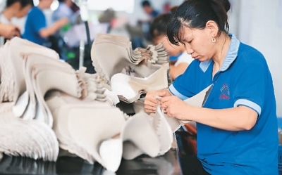 今年以來,福建省福州市倉山區(qū)持續(xù)優(yōu)化營商環(huán)境,進一步加大出口退稅支持力度,為企業(yè)提供精準服務,助力出口外貿(mào)企業(yè)積極開拓海外市場。圖為倉山區(qū)一家鞋企生產(chǎn)車間內(nèi),工人在生產(chǎn)出口女靴。