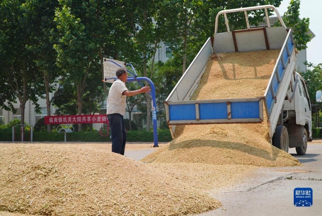 6月13日,農戶把剛收獲的小麥運到臨邑縣臨南鎮(zhèn)政府大院晾曬。