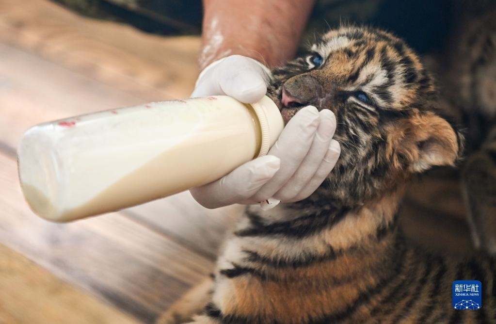 6月13日,在黑龍江東北虎林園的虎舍中,飼養(yǎng)員給東北虎幼崽喂奶。