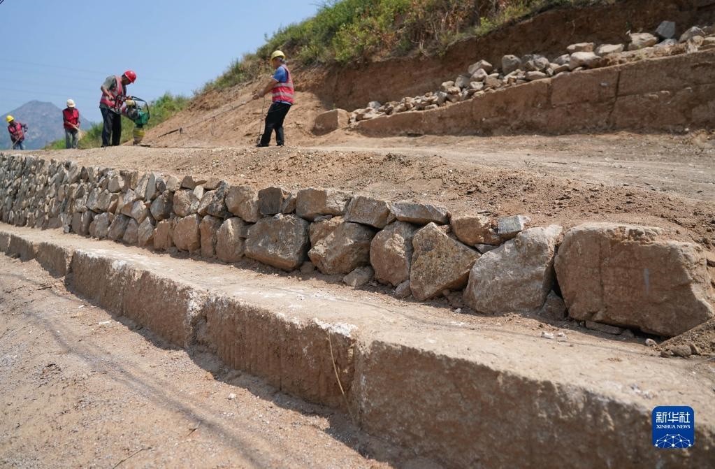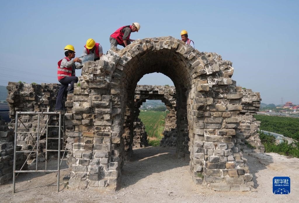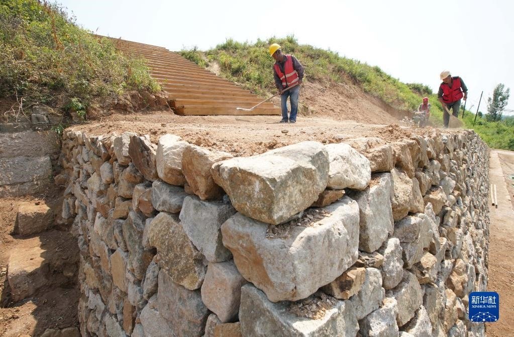近日,河北省秦皇島市山海關(guān)區(qū)山海關(guān)長城保護展示工程——腰鋪9號敵臺和51號墻臺馬道保護修繕工程施工穩(wěn)步推進。據(jù)介紹,腰鋪9號敵臺和51號墻臺馬道是山海關(guān)長城軍事防御體系中重要的附屬設(shè)施。修繕工程預計7月底完工。新華社記者 楊世堯 攝