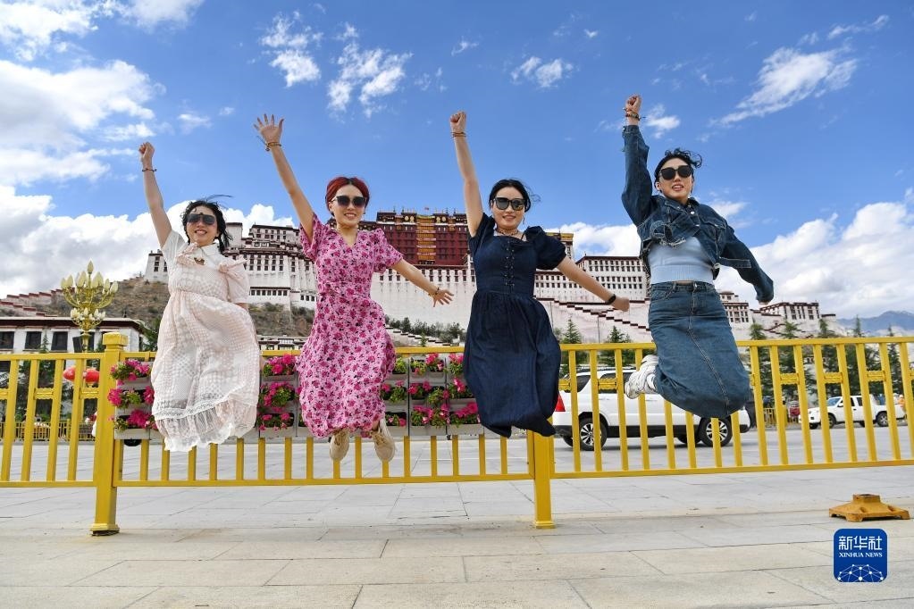 游客在布達拉宮廣場上合影留念(6月15日攝)。