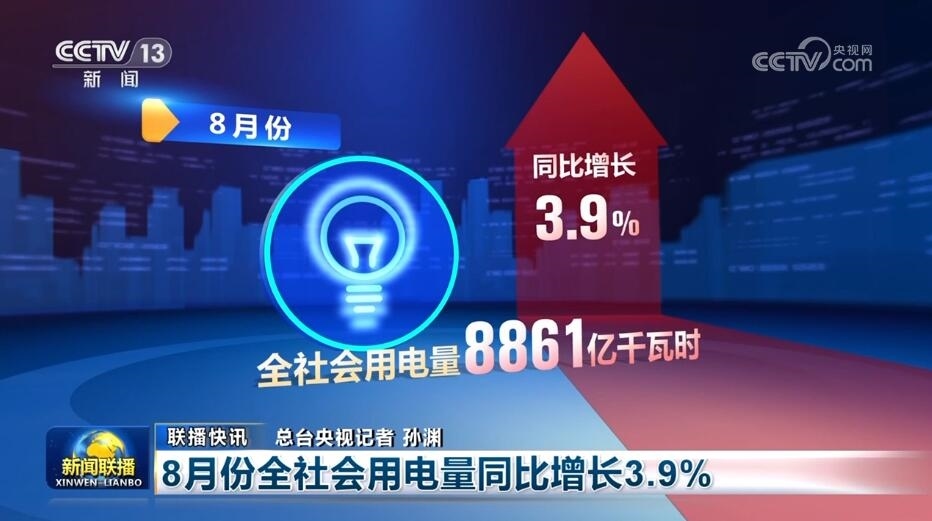 國家能源局今天發(fā)布用電量數(shù)據(jù)顯示,8月份,全社會用電量8861億千瓦時,同比增長3.9%。第一、二、三產(chǎn)業(yè)用電量均呈現(xiàn)增長態(tài)勢,同比分別增長8.6%、7.6%和6.6%,經(jīng)濟(jì)運(yùn)行繼續(xù)延續(xù)回升向好態(tài)勢。