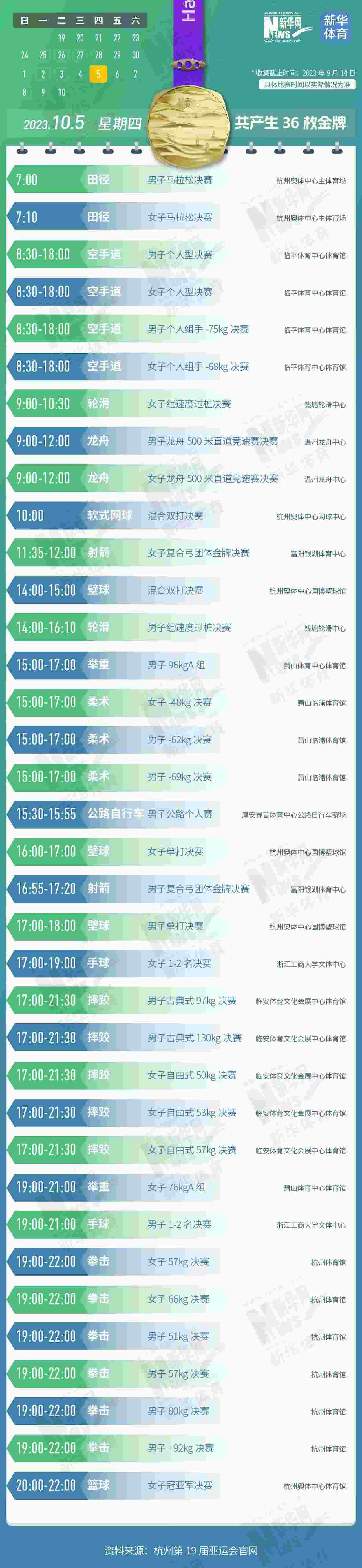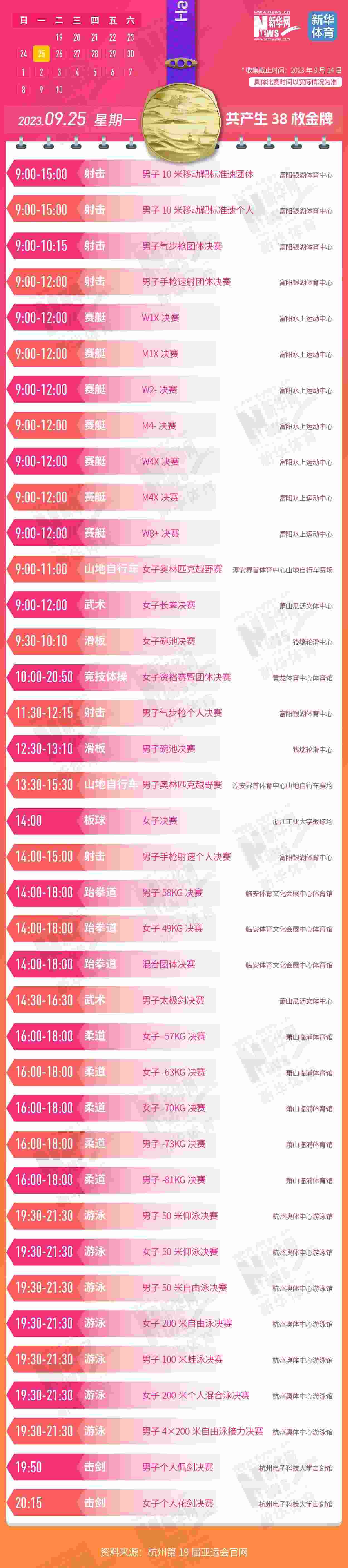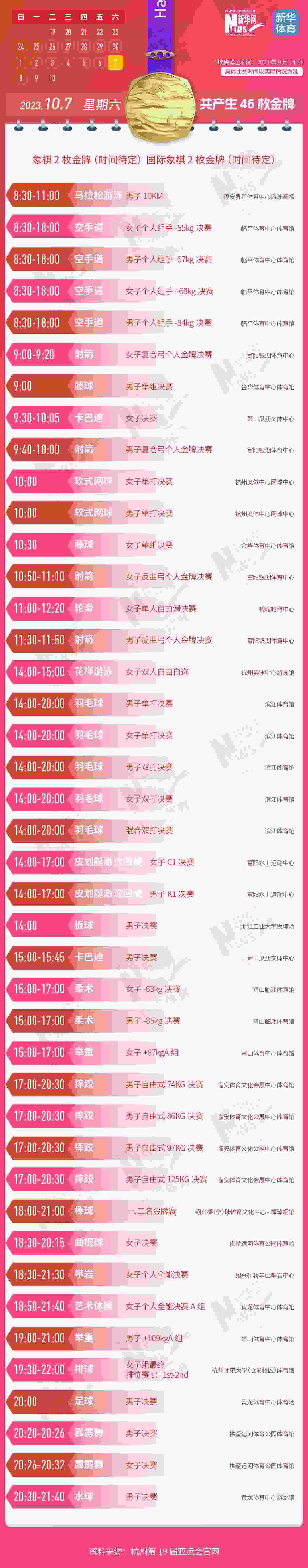 杭州第19屆亞運會即將開幕。本屆亞運會將產(chǎn)生481枚金牌,快收藏這份金牌賽事日歷,助你精準觀賽!