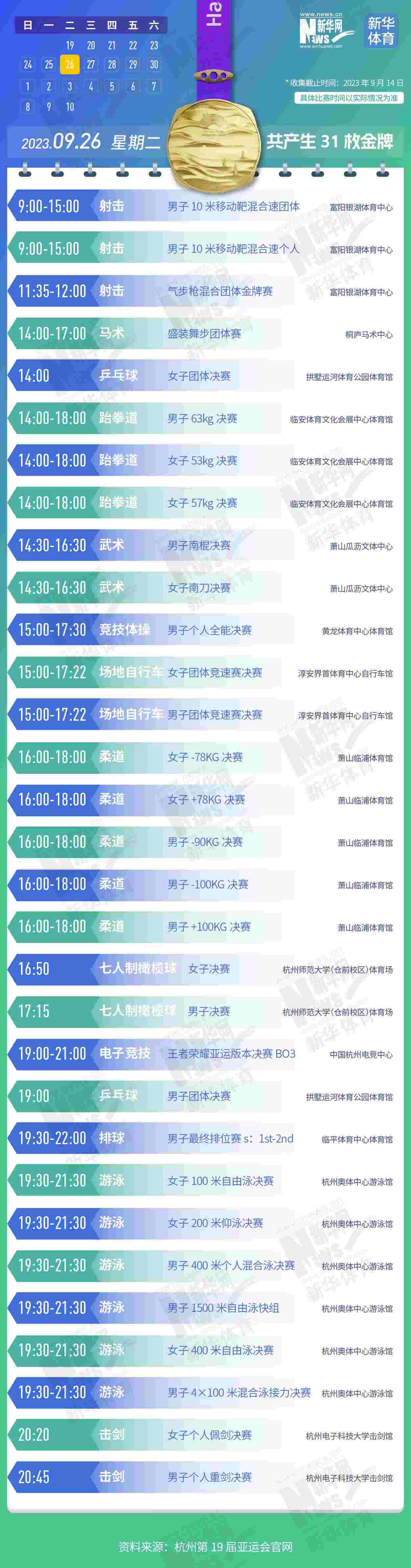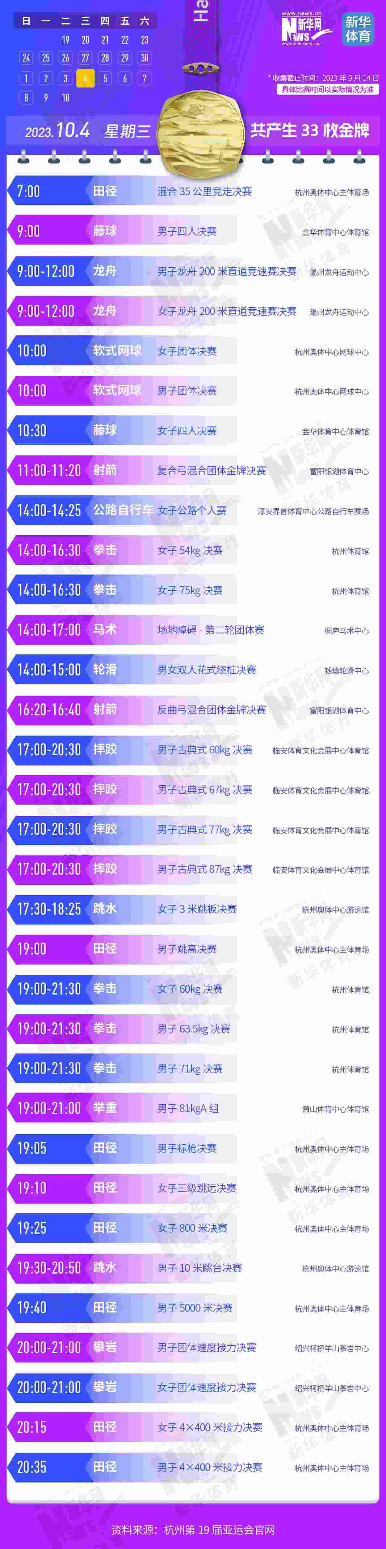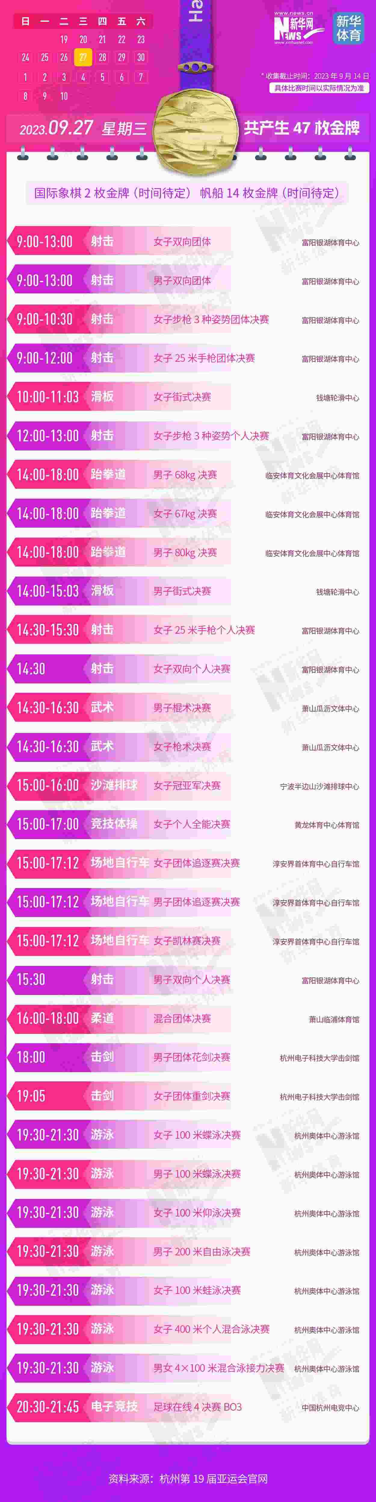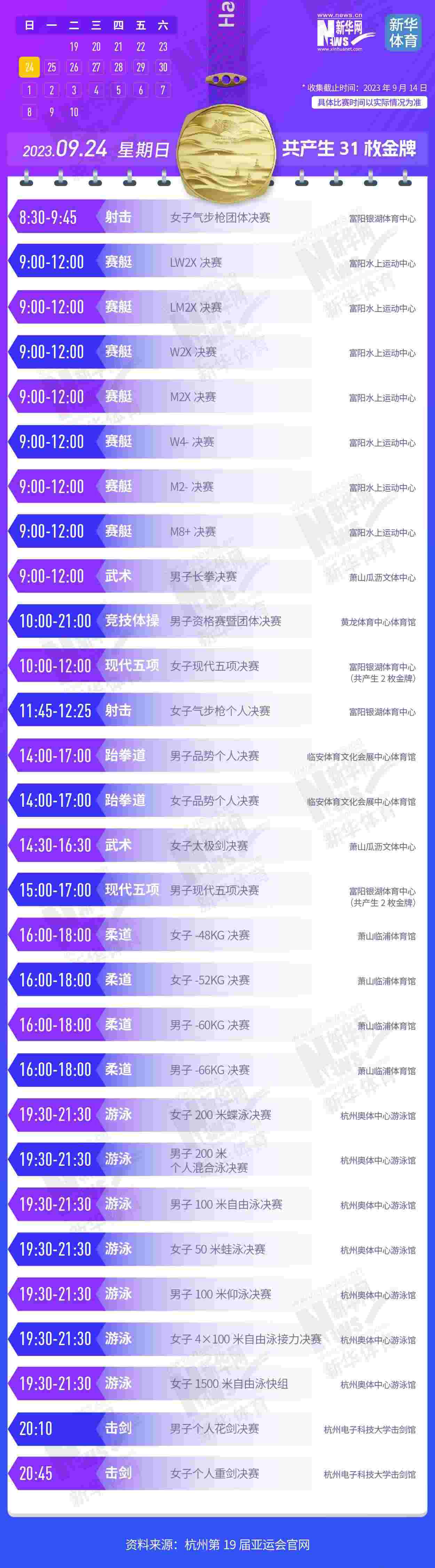 杭州第19屆亞運會即將開幕。本屆亞運會將產(chǎn)生481枚金牌,快收藏這份金牌賽事日歷,助你精準觀賽!