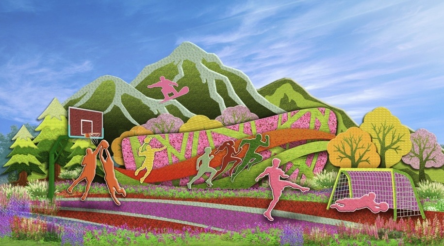 6,西單東北角的“全民健身”花壇頂高8.5米,以豐富多彩的全民健身為題材,配以籃球、羽毛球、跑步、滑雪等運動場景,寓意全民健身共享美好生活。