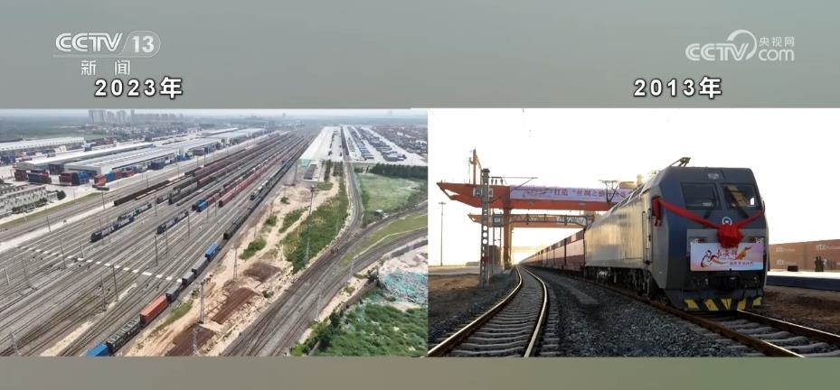 幾百輛剛出廠的新能源汽車(chē)整齊地排列在站臺(tái)上陸續(xù)裝箱,馬上它們將乘坐中歐班列“長(zhǎng)安號(hào)”前往中亞。2023年是“一帶一路”倡議提出10周年,也是中歐班列“長(zhǎng)安號(hào)”開(kāi)行10周年。每天都有數(shù)以?xún)|計(jì)的貨物在這里集散。