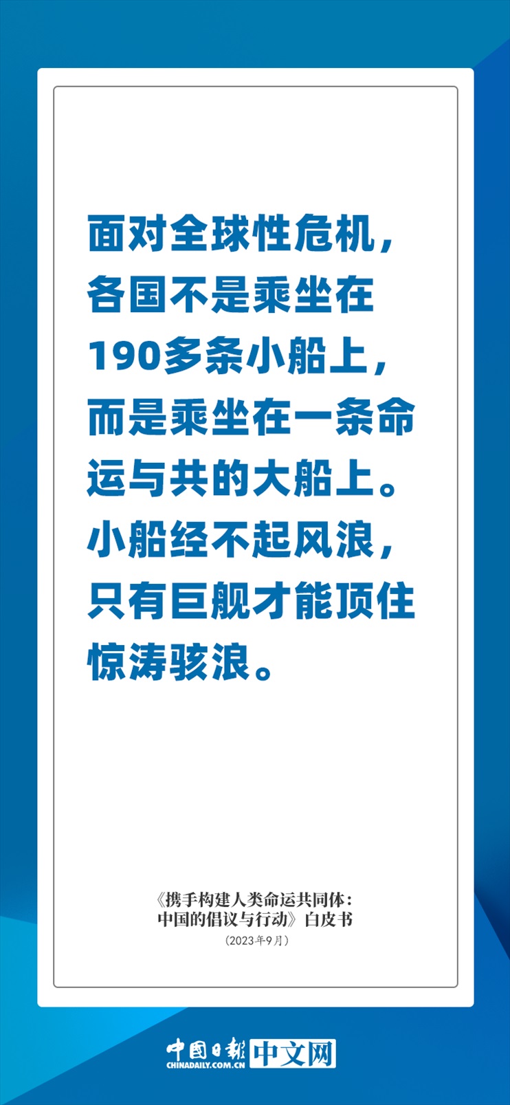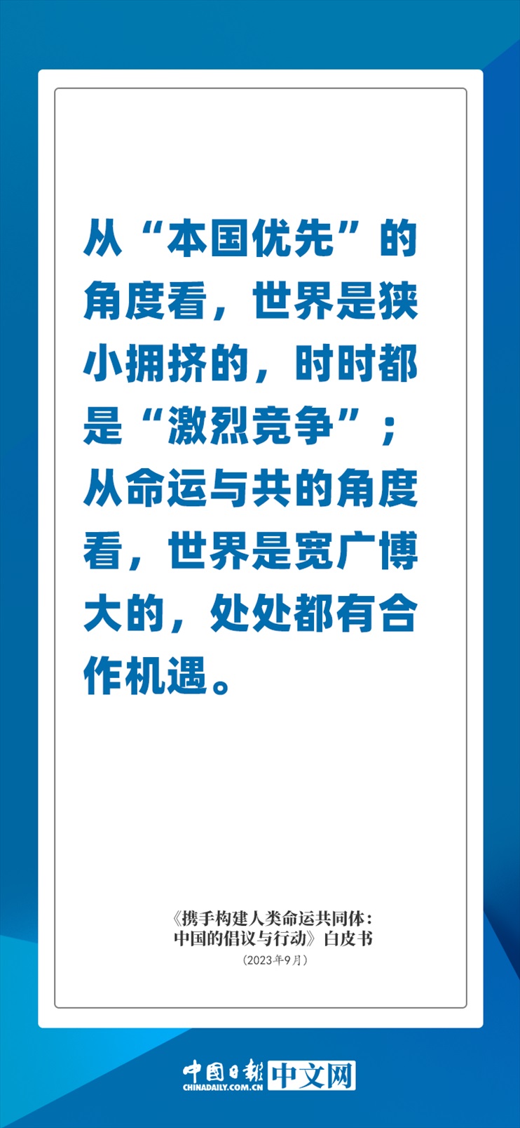 國(guó)務(wù)院新聞辦公室于2023年9月26日發(fā)布《攜手構(gòu)建人類(lèi)命運(yùn)共同體:中國(guó)的倡議與行動(dòng)》白皮書(shū),發(fā)人深思催人奮進(jìn)。