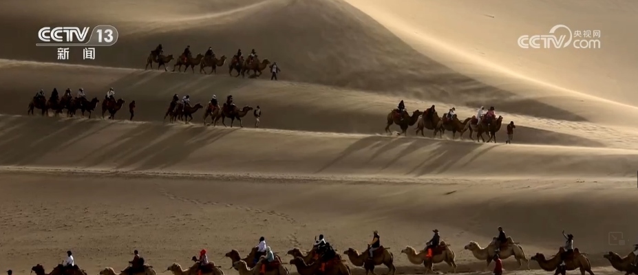 在甘肅酒泉,游客騎著駱駝在鳴沙山月牙泉景區(qū)游覽,在沙漠中體驗異域風(fēng)情。
