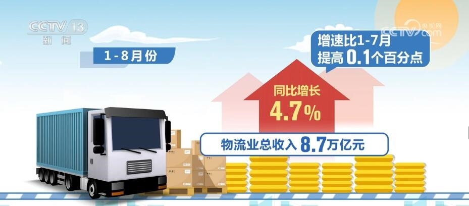 1—8月份,物流業(yè)總收入8.7萬億元,同比增長4.7%,增速比1—7月提高0.1個(gè)百分點(diǎn)。