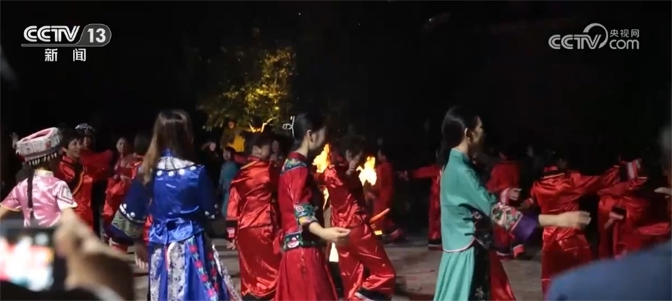 隨著歡快的音樂(lè)響起,當(dāng)?shù)卮迕翊┥仙术r艷的節(jié)日盛裝,踏著鼓點(diǎn),圍著篝火跳起土家擺手舞,豐收的喜悅洋溢在村民們的臉上,游客們加入其中,大家手牽著手,共同舞出金秋和美鄉(xiāng)村新畫(huà)卷。