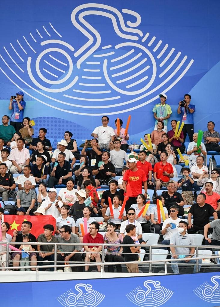 9月26日,觀眾在杭州亞運會場地自行車男子團體競速賽場邊觀賽。新華社記者 胡虎虎 攝