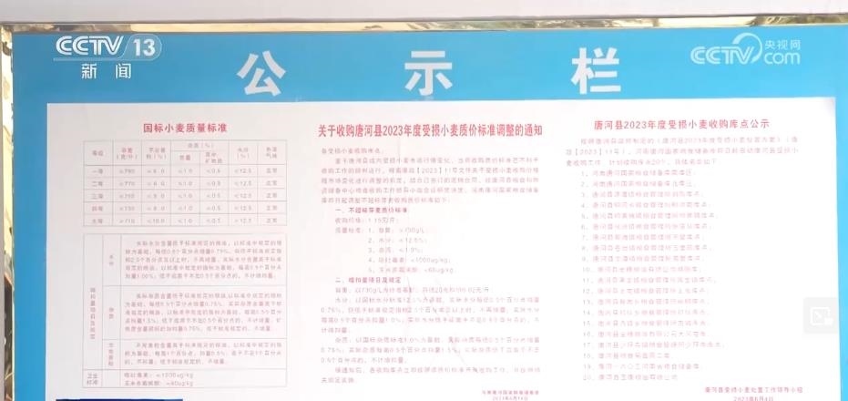 記者在這家糧食儲備庫的公示欄里看到了一份《收購唐河縣受損小麥質(zhì)價標(biāo)準(zhǔn)調(diào)整的通知》,里面明確了受損小麥的收購價格是1.15元每斤,而這個價格只比正常小麥?zhǔn)召弮r1.4元左右低了0.3元。這張通知的落款日期是6月4日,而當(dāng)?shù)剞r(nóng)戶普遍是在6月3日收完糧食,這也在第一時間讓老百姓吃下了“定心丸”。