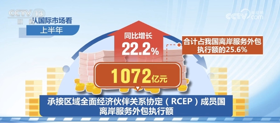 從國際市場看,上半年,承接區(qū)域全面經(jīng)濟(jì)伙伴關(guān)系協(xié)定(RCEP)成員國離岸服務(wù)外包執(zhí)行額1072億元,同比增長22.2%,合計(jì)占我國離岸服務(wù)外包執(zhí)行額的25.6%。
