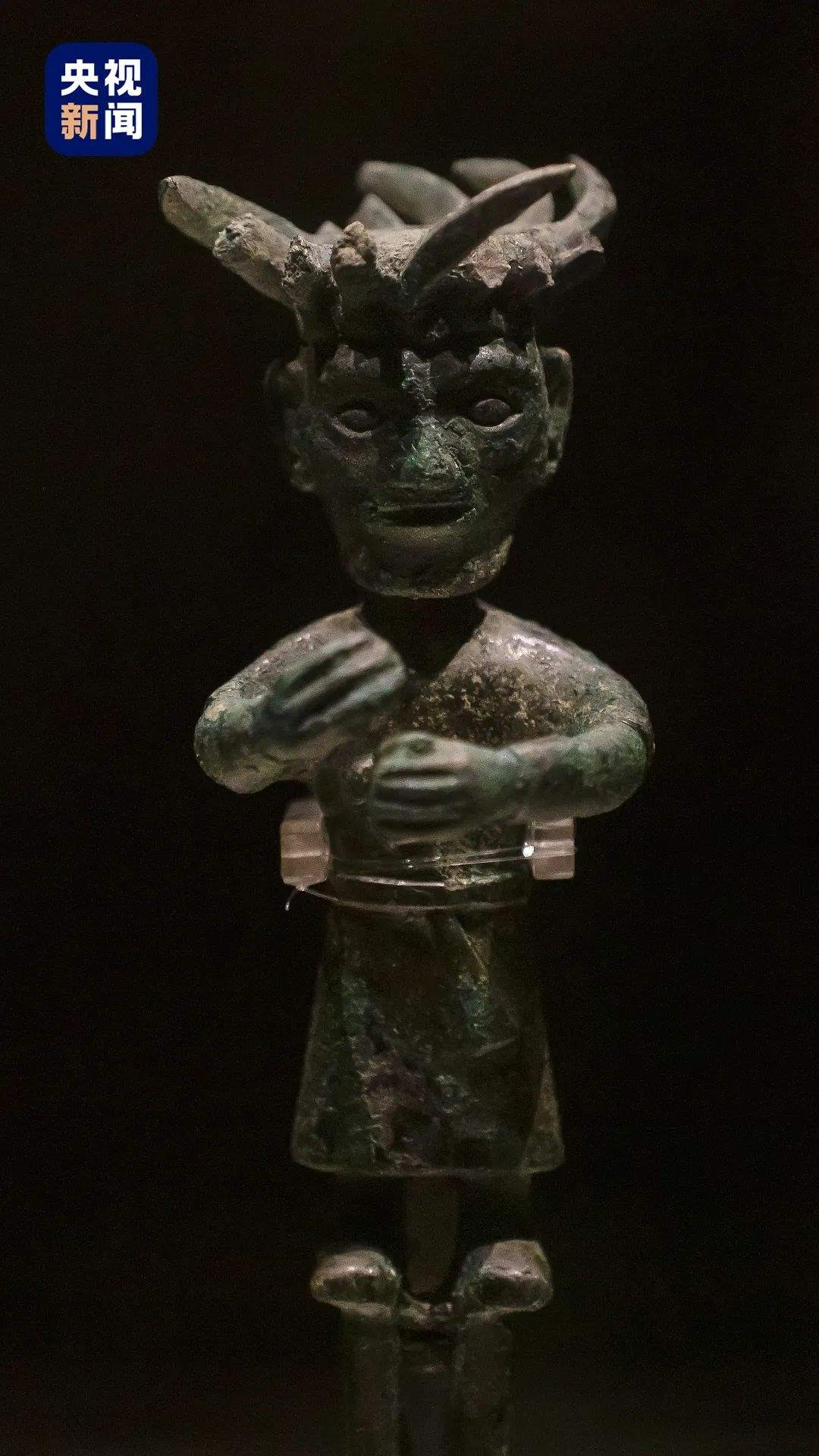 △金沙遺址銅立人。銅立人頭上的渦形帽圈與“太陽(yáng)神鳥(niǎo)”的太陽(yáng)圖案相似,象征光芒四射的太陽(yáng)。
