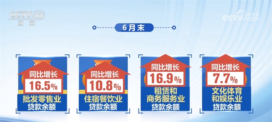 數(shù)據(jù)顯示,6月末,批發(fā)零售業(yè)、住宿餐飲業(yè)、租賃和商務(wù)服務(wù)業(yè)、文化體育和娛樂業(yè)貸款余額同比分別增長16.5%、10.8%、16.9%、7.7%,信用卡、汽車和其他綜合消費(fèi)貸款比年初增加7100多億元,有力支持了相關(guān)領(lǐng)域消費(fèi)恢復(fù)發(fā)展。