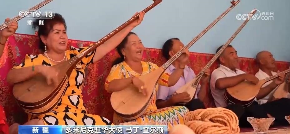 駐華使節(jié)們走進喀什古城的街市巷陌,感受當?shù)鬲毺氐拿褡逦幕?;在克孜爾千佛洞,領(lǐng)略跨越千年的石窟藝術(shù);來到新疆民間手工樂器制作第一村庫車市新和縣加依村,同當?shù)匕傩找黄疠d歌載舞;觀看非遺項目十二木卡姆等一系列活動,讓使節(jié)們感嘆,新疆少數(shù)民族傳統(tǒng)文化和生活習俗得到了充分保護。