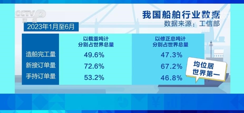 工業(yè)和信息化部數據顯示,2023年1月—6月,我國造船完工量、新接訂單量和手持訂單量,以載重噸計分別占世界總量的49.6%、72.6%和53.2%,以修正總噸計分別占47.3%、67.2%和46.8%,均位居世界第一。