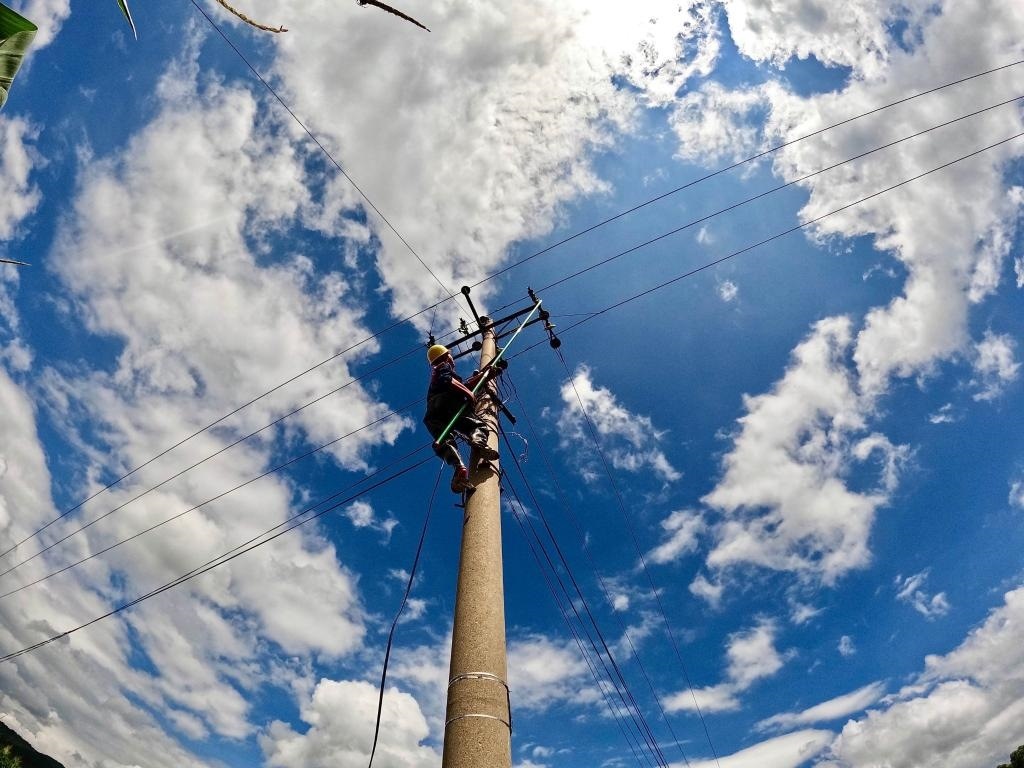 8月5日,電力搶修人員在進(jìn)行作業(yè)。(王潤澤 攝)