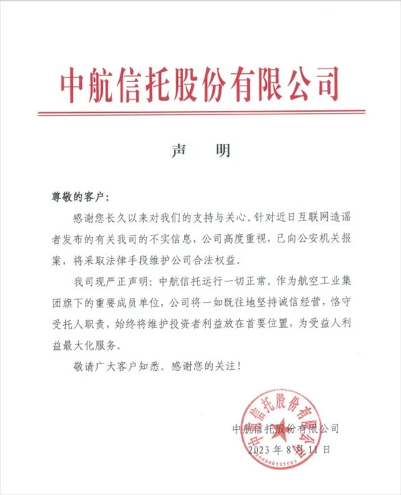 中航信托股份有限公司(下稱“中航信托”)在微信官方公眾號發(fā)文回應(yīng)稱,“針對近日互聯(lián)網(wǎng)造謠者發(fā)布的有關(guān)我司的不實(shí)信息,公司高度重視,已向公安機(jī)關(guān)報案,將采取法律手段維護(hù)公司合法權(quán)益。我司現(xiàn)嚴(yán)正聲明:中航信托運(yùn)行一切正常。作為航空工業(yè)集團(tuán)旗下的重要成員單位,公司將一如既往地堅持誠信經(jīng)營,恪守受托人職責(zé),始終將維護(hù)投資者利益放在首要位置,為受益人利益最大化服務(wù)。”