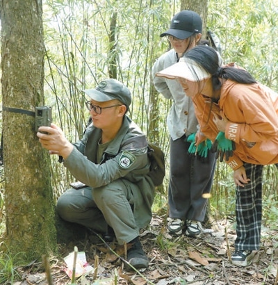 四川大相嶺大熊貓野化放歸研究基地巡護(hù)員在安裝調(diào)試紅外線相機(jī)。楊愛(ài)玲攝